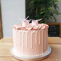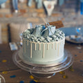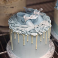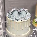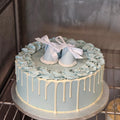 Super sød babyshower kage med hvidchokolade dryp og håndlavede sukker sko på toppen. Overrask din veninde med en smuk kage til hendes babyshower!